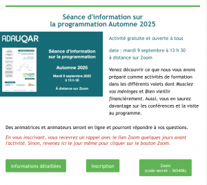 Il est possible de s’inscrire via le site Web, en appelant ou via la page Facebook de la Société Alzheimer Brome-Missisquoi et Haute-Yamaska.