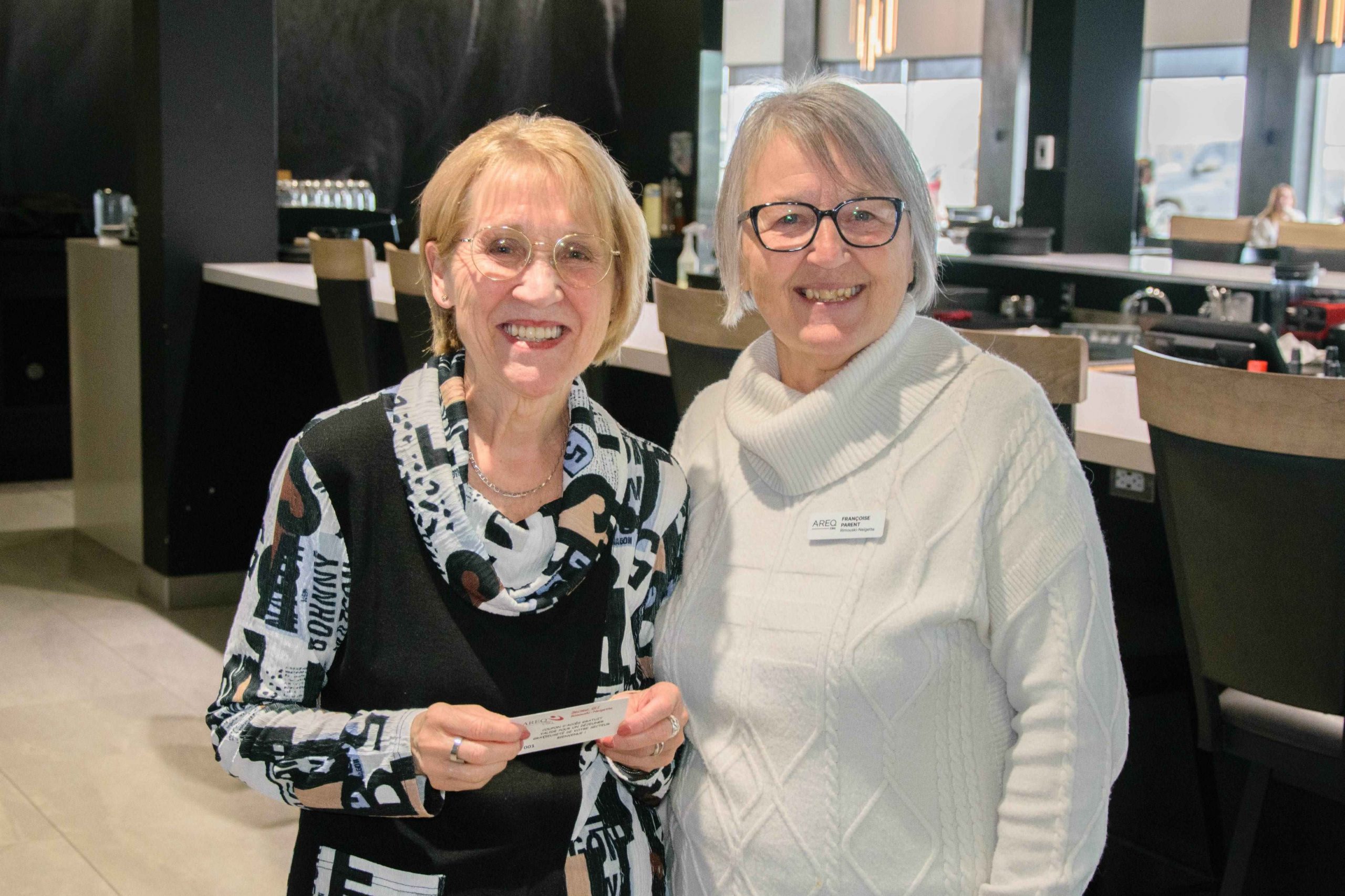 Le tirage moitié-moitié pour amasser des fonds servant à soutenir la Fondation Laure-Gaudreault fut remporté par Madame Graziella Dion, ainsi une somme de 242$ sera partagée. De plus, un tirage au sort fut fait pour distribuer des coupons pour un déjeuner gratuit. Madame Marie-Marthe Dionne et madame Yvette Guimond furent les heureuses gagnantes de ce tirage.